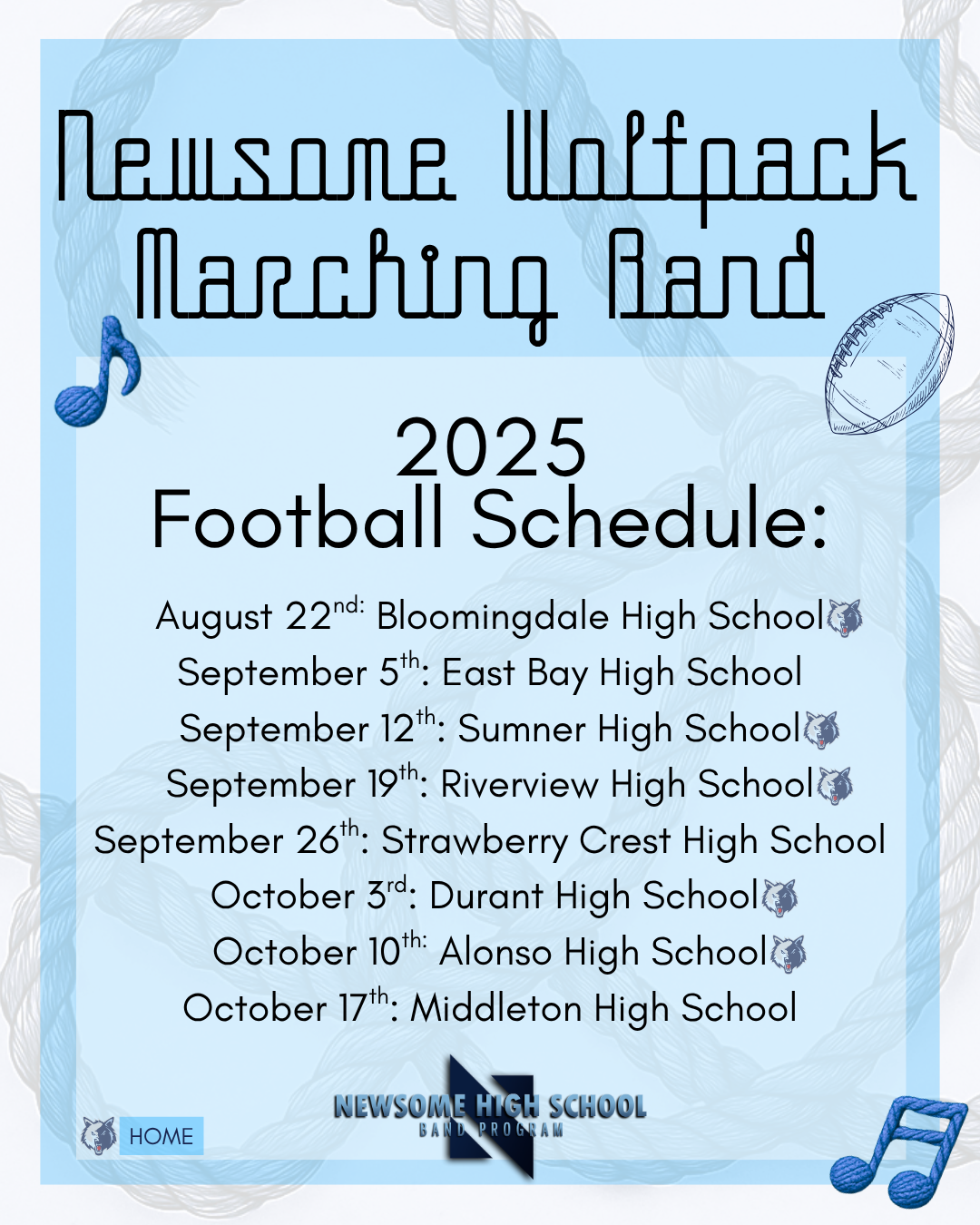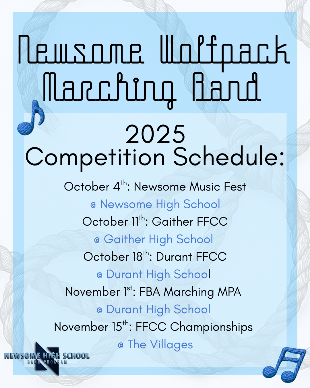 During their first marching season under director John Owen Davis II, the Wolfpack Marching Band had a regular season clean sweep, being named grand champions, earning the top spot at each regional competition they attended. They also continued the Newsome Band Program’s longstanding pursuit of perfection by earning a Straight Superior rating at the annual Florida Bandmasters Association Marching Music Performance Assessment.